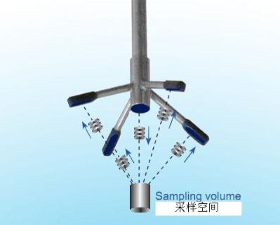 聲波脈沖從中間 的換能器發(fā)送,聲波在測 量空間經(jīng)過水體中的粒 子散射,由另外四個接收 器接收測量其變化。