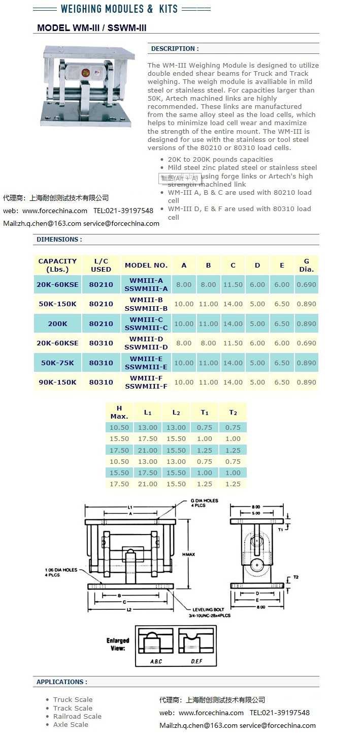 WM-III稱重模塊測(cè)力傳感器旨在利用雙頭剪力梁進(jìn)行卡車和軌道稱重。稱重模塊可在低碳鋼或不銹鋼。容量大于50K, Artech加工鏈接強(qiáng)烈推薦。這些鏈接由與測(cè)壓元件相同的合金鋼制造,這有助于最大限度地減少測(cè)壓元件的磨損,并最大限度地提高整個(gè)安裝的強(qiáng)度。WM-III設(shè)計(jì)用于不銹鋼或工具鋼版本的80210或80310測(cè)壓元件。
